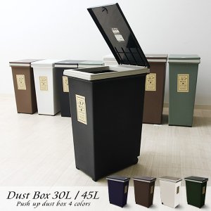 【商品説明】 使いやすいプッシュ式ダストボックスの登場です。シンプルで清潔感のあるデザインに加え、30リットルと45リットルの2サイズをご用意しております。ゴミの種類や分別がしやすいよう4色展開。単品で使用しても、色違いで分別し、複数個並べてもご使用頂けます。キャスター付きなので移動も楽にでき、見た目と快適な使い心地に、満足いただけるダストボックスです。
