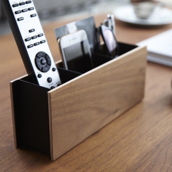 美しい天然木の木目が優しく、金属とのコンビネーションがスタイリッシュなリモコンラック。テレビやエアコン、照明のリモコン、ペンなど細々としたものも仕切りがあるので自立します。各仕切りの底には取り外せるすべり止めゴムシートが敷いてあり、底に傷がつきにくくなっています。仕切りの隙間にDMなども収納可能。大容量なのでオフィスのデスクにおいても、散らかりがちなテーブルの上が簡単にすっきり整理できます。
