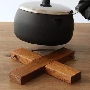 細木の鍋敷きなので、木に通してある紐をフックにかけてコンパクトに収納できます。